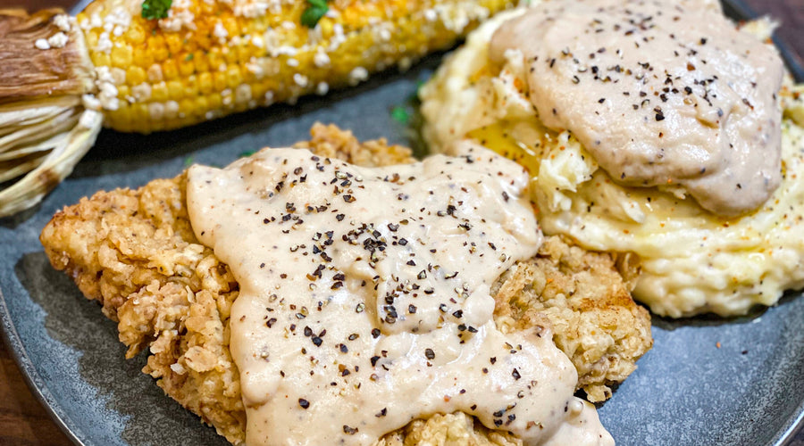 Chicken Fried Steak with Smashed Potatoes & Cracked Pepper Gravy