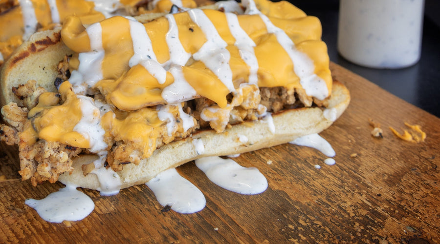 A Chicken Bacon Ranch Cheesesteak off a griddle with our homemade jalapeño ranch is one of the tastiest sandwiches you will ever eat!