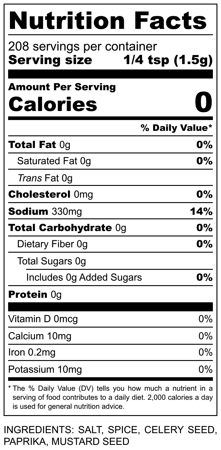 Ingredients: Salt, spices including paprika, celery, mustard and ginger.