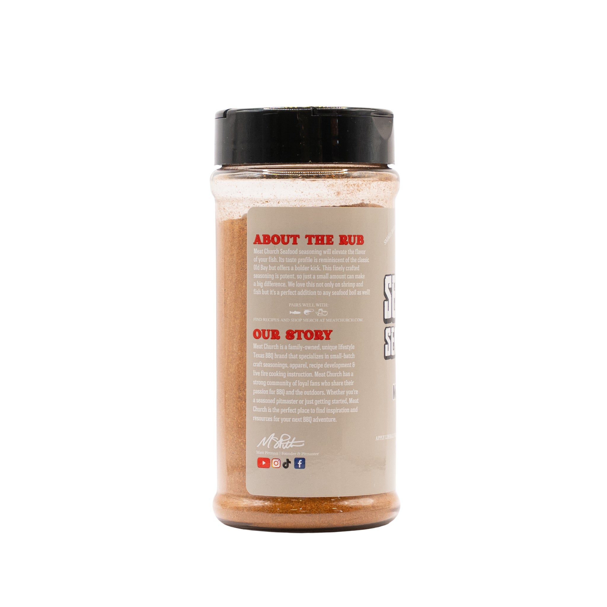 Meat Church Seafood Seasoning will kick up your fish a notch. The flavor profile will remind you of the classic Old Bay but our has more pop. It's a very fine seasoning and a little goes a long way.